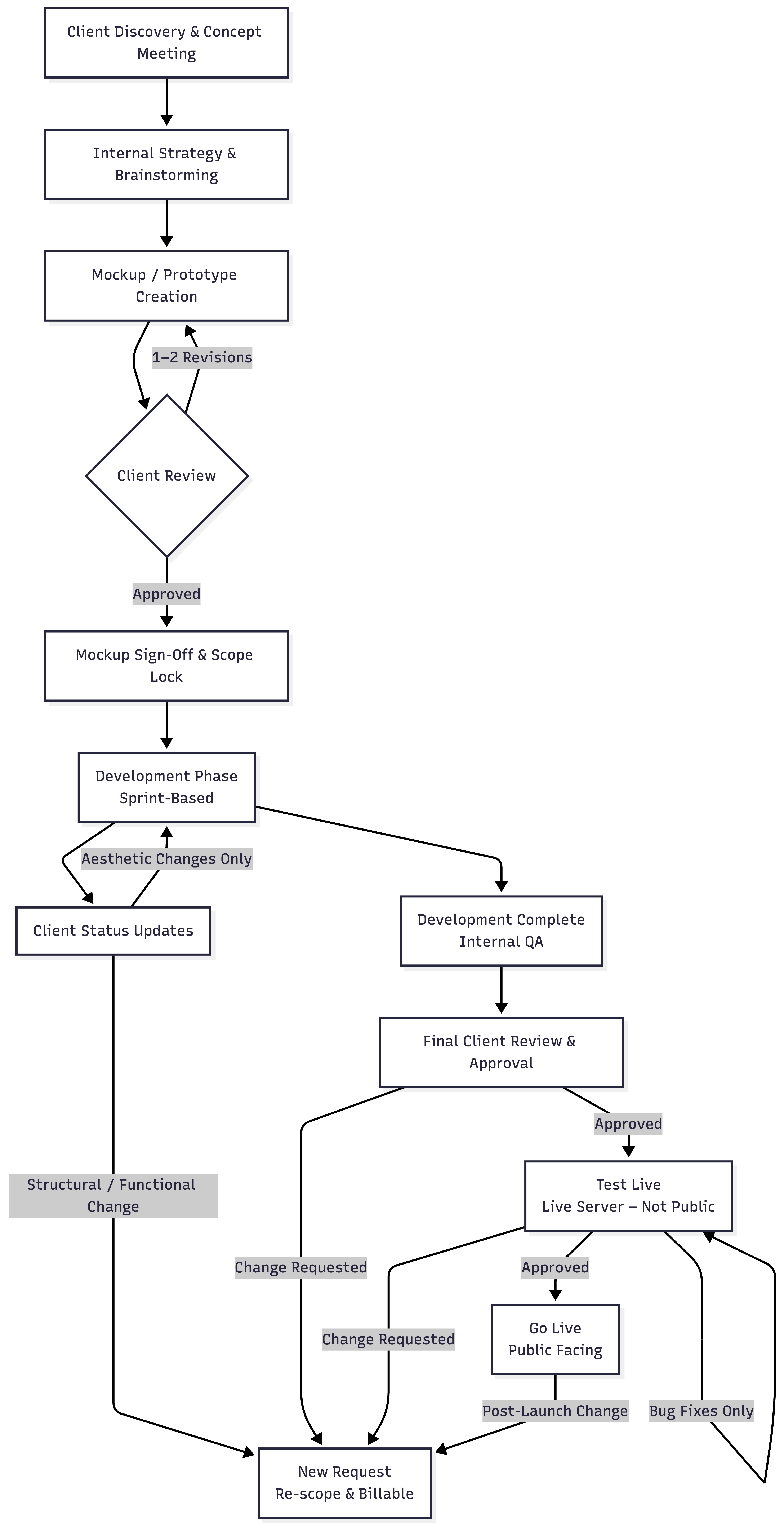 Overall, it’s a model that balances collaboration with control—clients stay involved at the right points, while the team can deliver efficiently and with fewer surprises. It’s how experienced agencies and product teams consistently deliver complex projects on time and to a high standard.